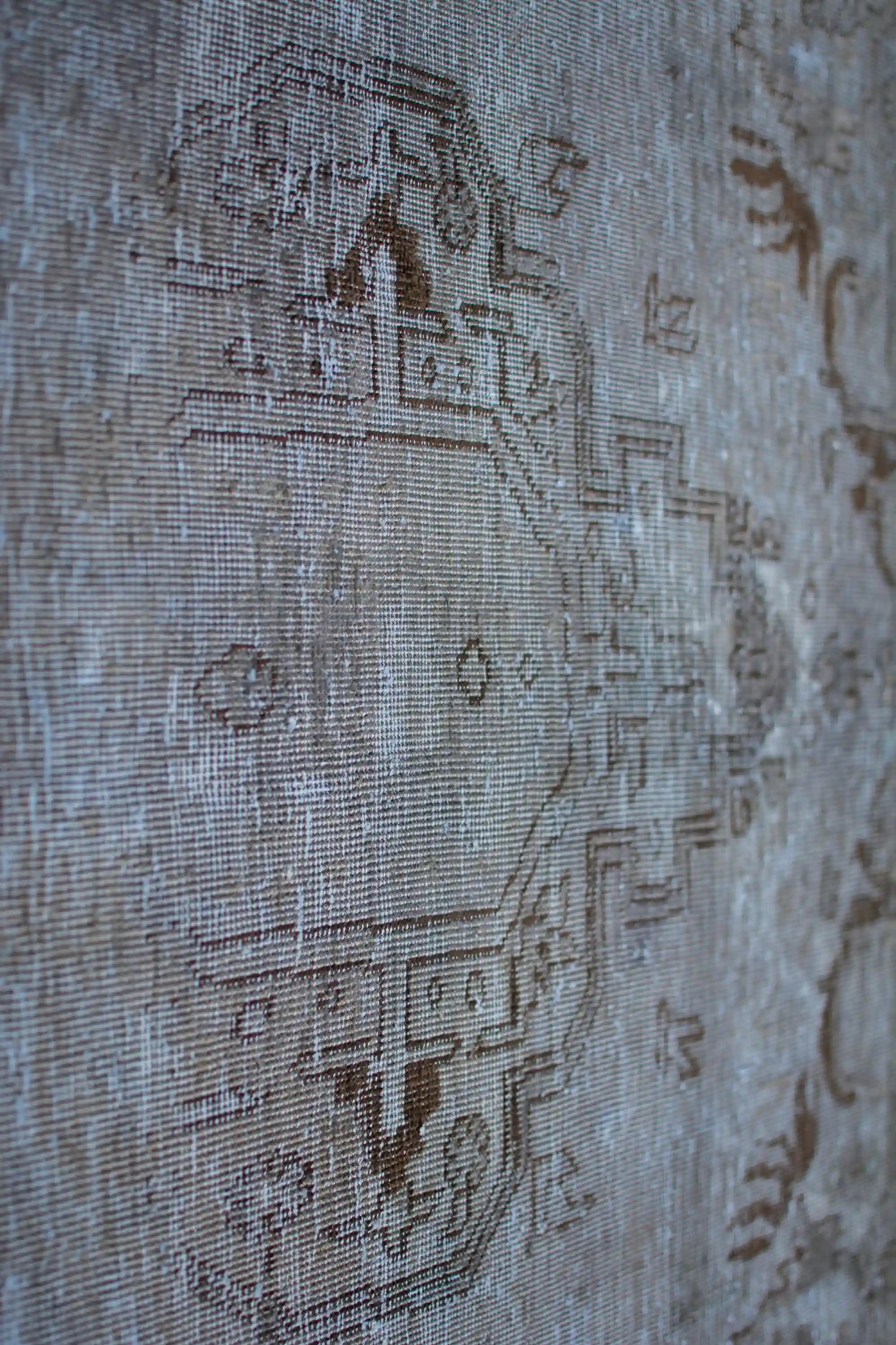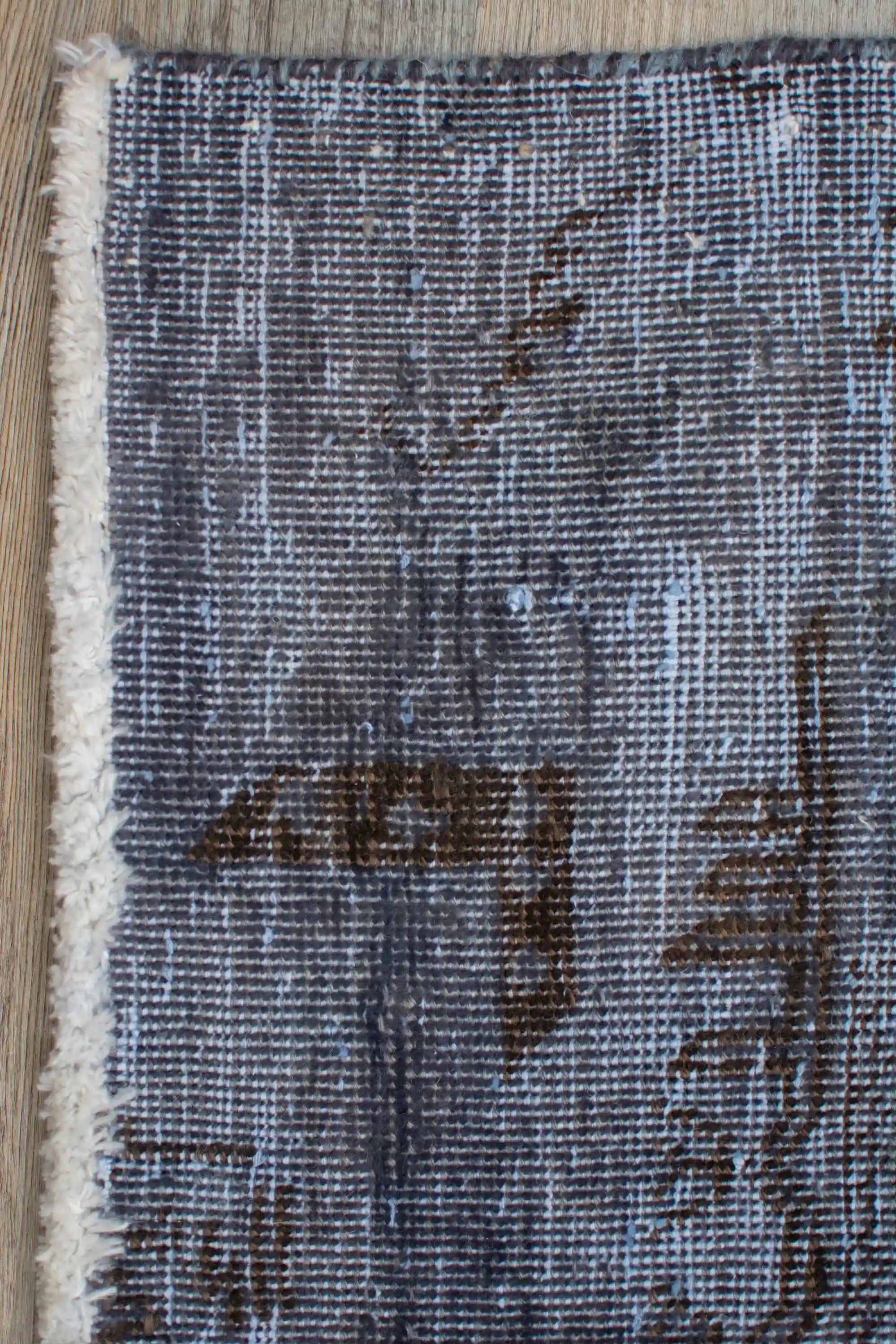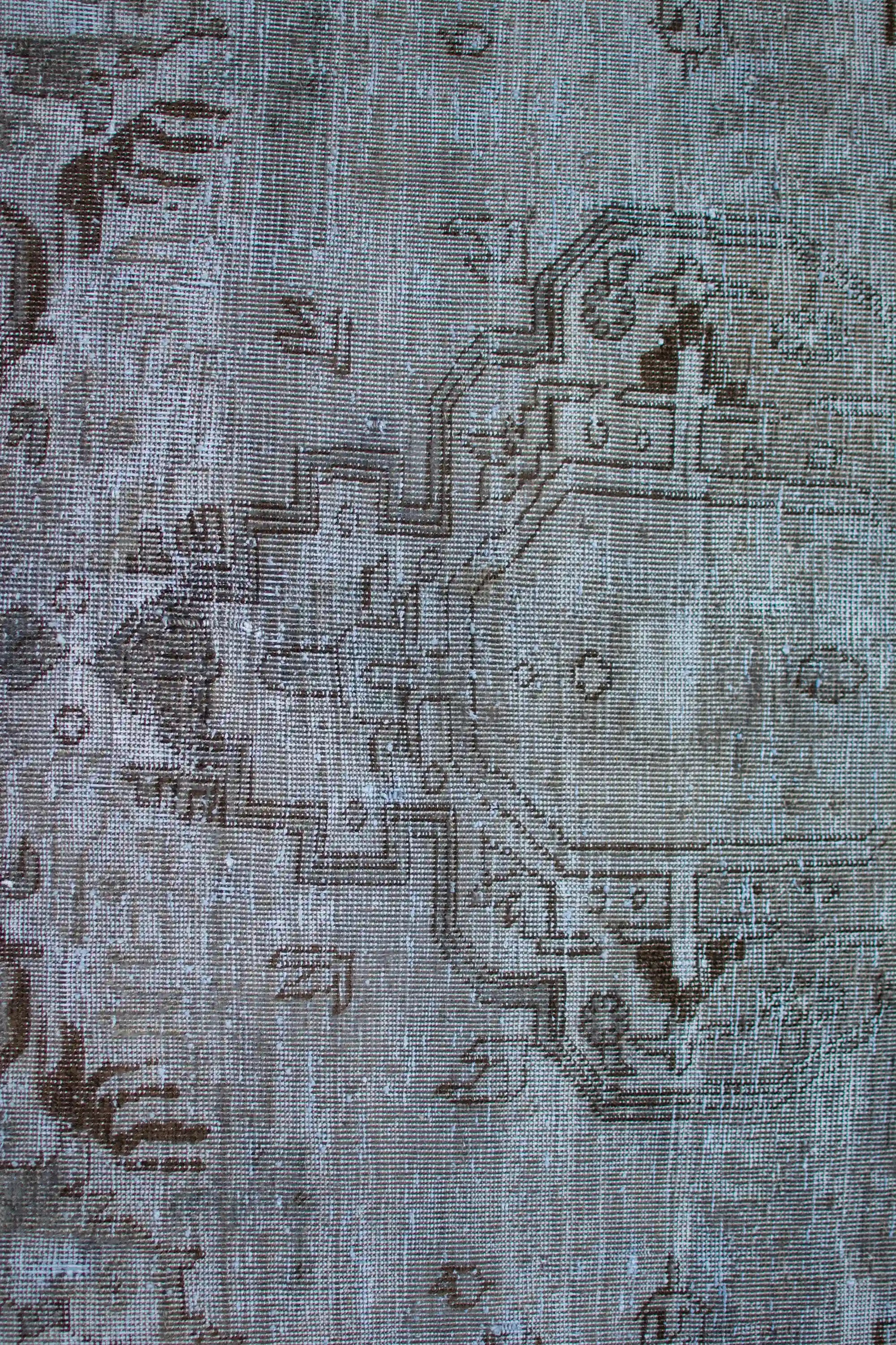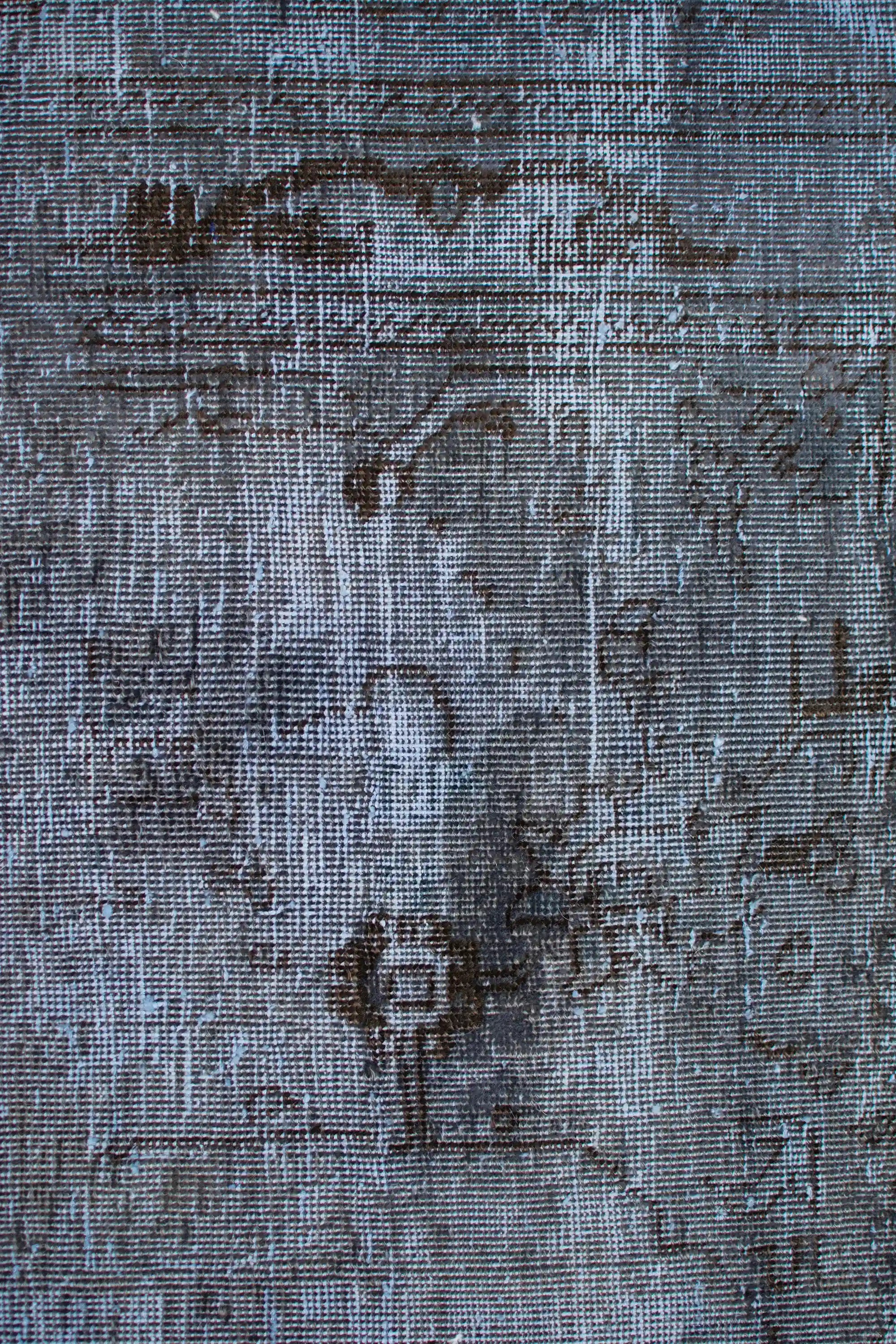 Alfombra anudada a mano por artesanos, reciclada y modernizada a través de tratamientos de teñido y carving, logrando un diseño clásico con colores y texturas modernas.