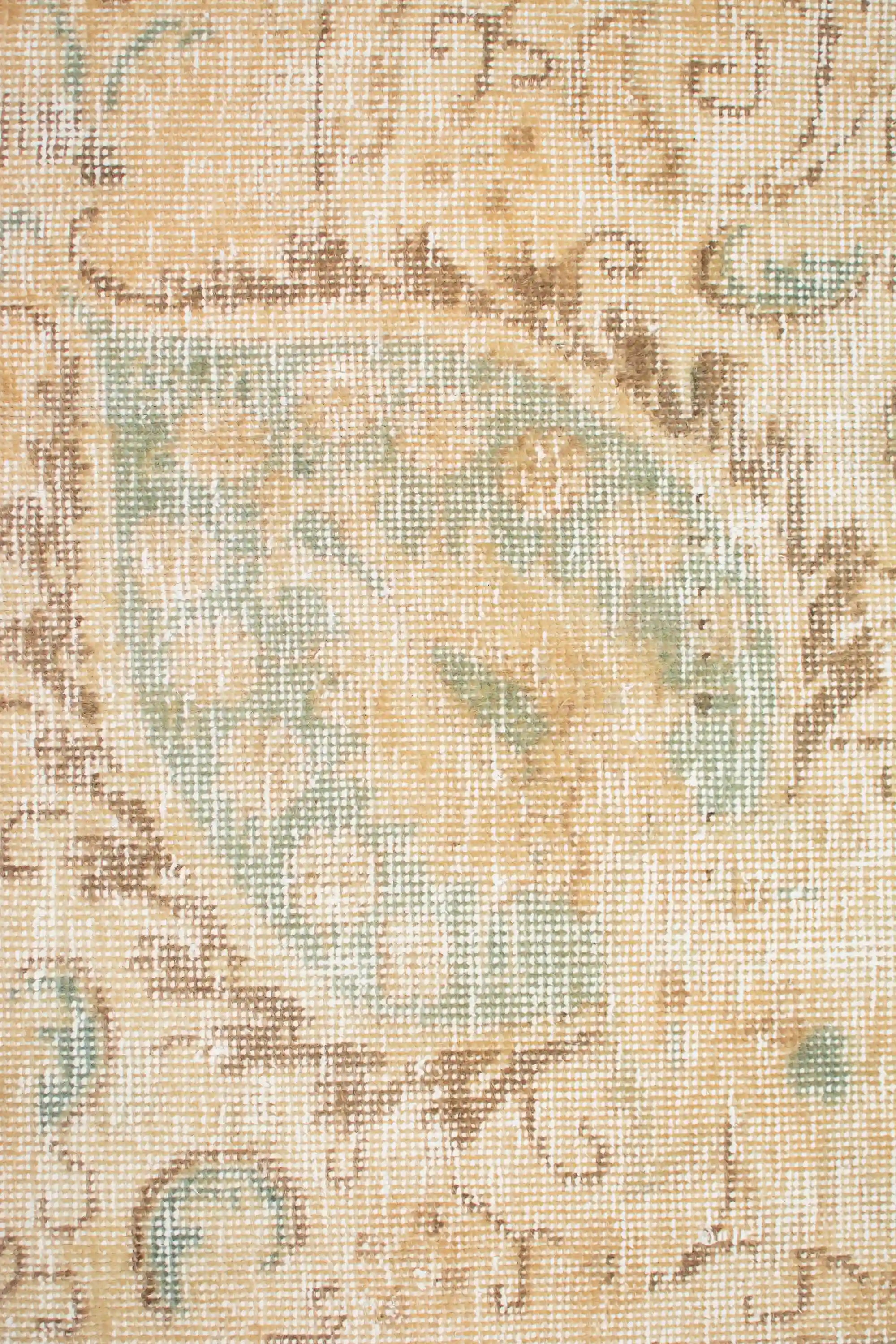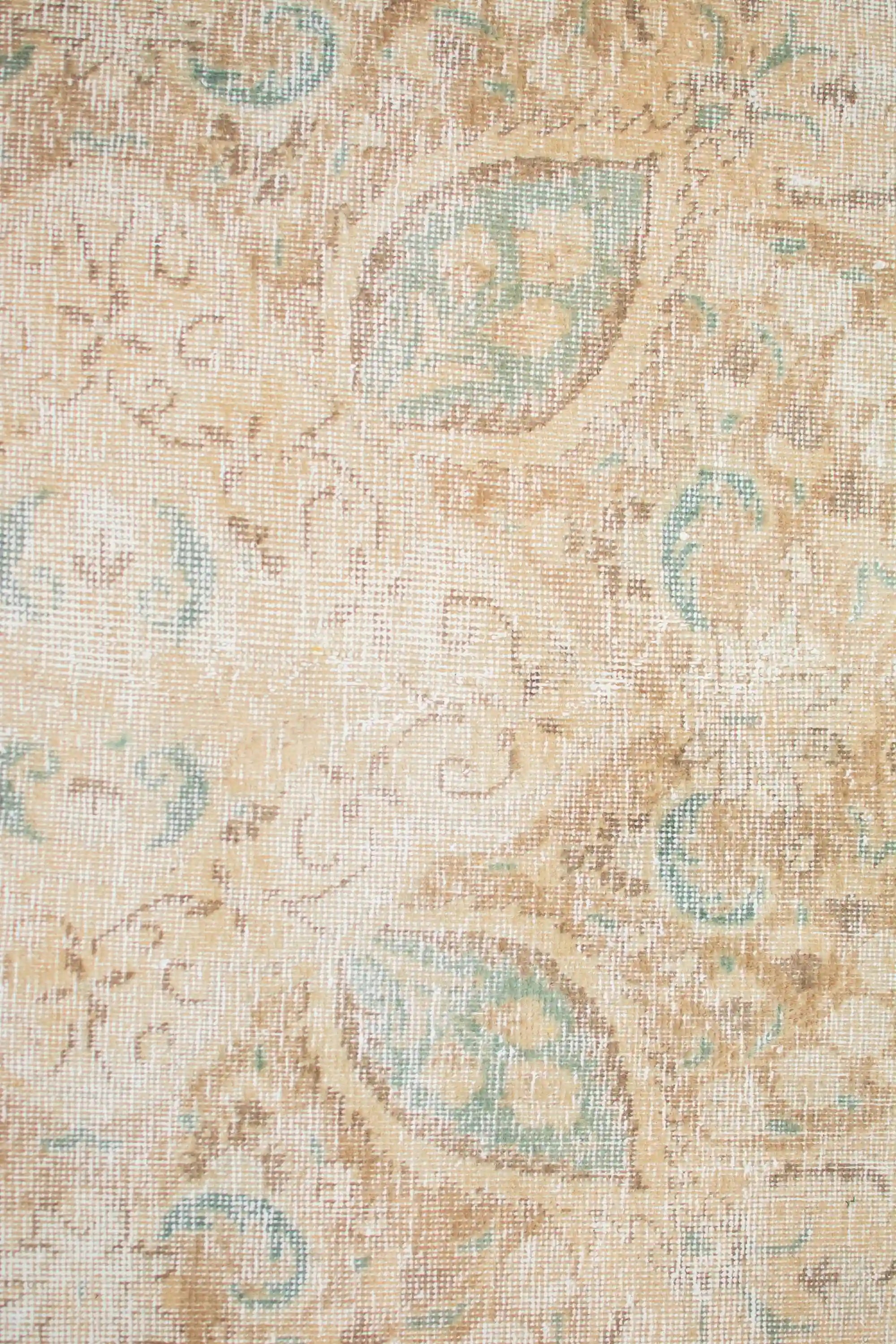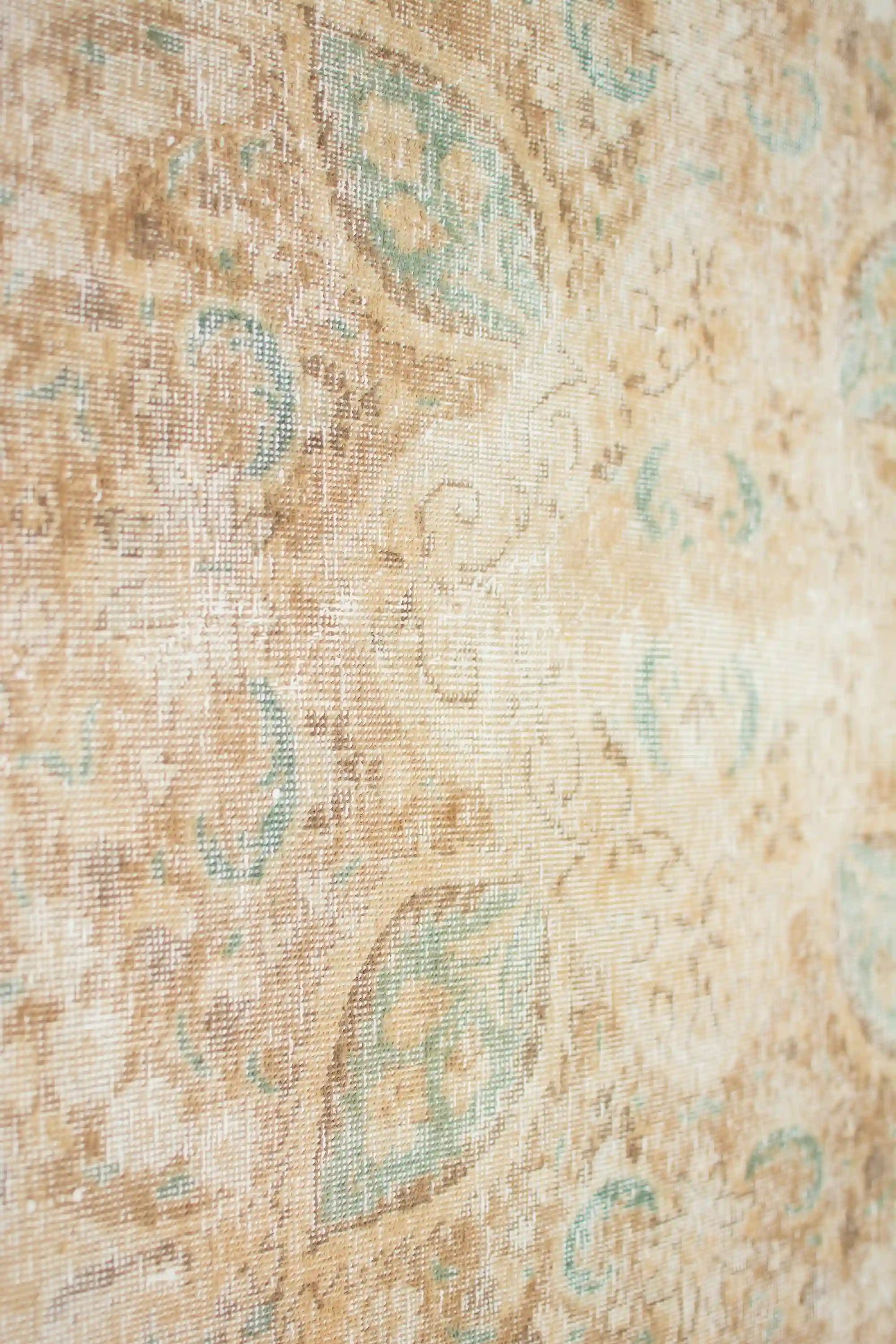 Alfombra anudada a mano por artesanos, reciclada y modernizada a través de tratamientos de teñido y carving, logrando un diseño clásico con colores y texturas modernas.