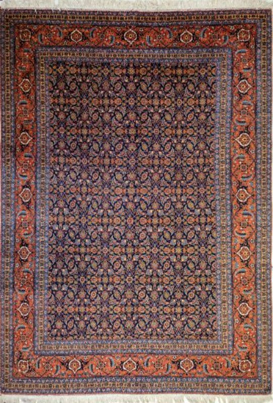 Alfombra anudada a mano por artesanos iraníes, con un medallón central rodeado de diseños florales. Posee trazos bien definidos gracias al anudado fino, donominados "RAJ", que es la cantidad de nudos que caben en el largo de un cigarro.