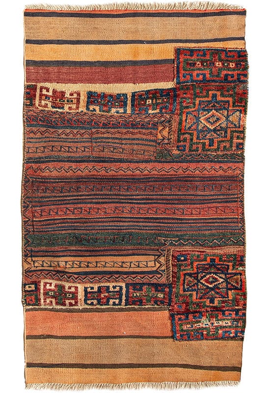 Las alforjas persas nómadas son piezas únicas de artesanía tradicional, tejidas a mano por comunidades nómadas de Irán con lana de alta calidad y tintes naturales. Originalmente diseñadas para transportar provisiones durante los viajes, su diseño incluye dos compartimentos amplios unidos por una tira central, adornados con patrones geométricos cargados de simbolismo cultural. Hoy en día, estas alforjas se han convertido en piezas decorativas versátiles, ideales como elementos decorativos o alfombras, que aportan un toque bohemio y auténtico a cualquier espacio, combinando funcionalidad con la rica historia del arte textil persa.