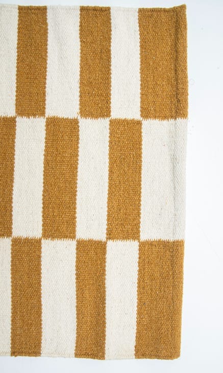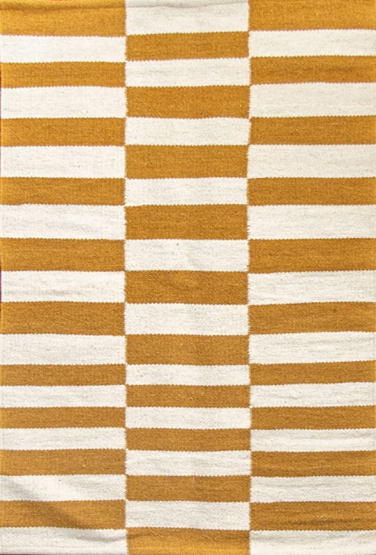 Alfombra kelim tejida a mano en India, utilizando una técnica de tejido plano. Esta pieza se distingue por su diseño sencillo en tonos natural y mostaza, ofreciendo un equilibrio perfecto entre artesanía y elegancia con un acento de color.