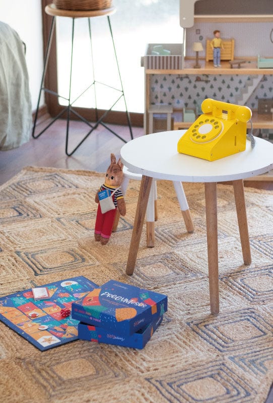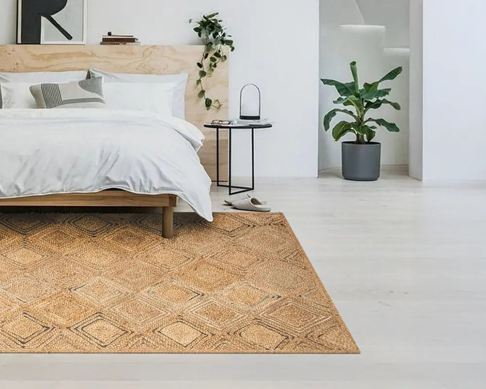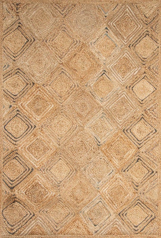 Alfombra Bazhars artesanal, tejida a mano por artesanos con finas hebras de jute y finos diseños de rombos de color crudo intercalando toques en azul. Excelentes terminaciones con backing anti deslizante por debajo.
